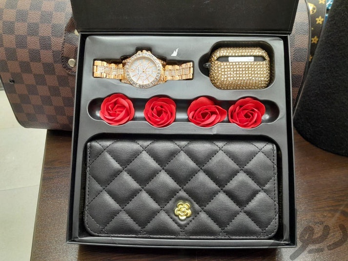 ويشمل الطقم أيضًا سماعات AirPods عالية الجودة بصوت نقي وعميق، ومحفظة جلدية سوداء أنيقة تجمع بين الرفاهية والعملية في استخدامك اليومي.
