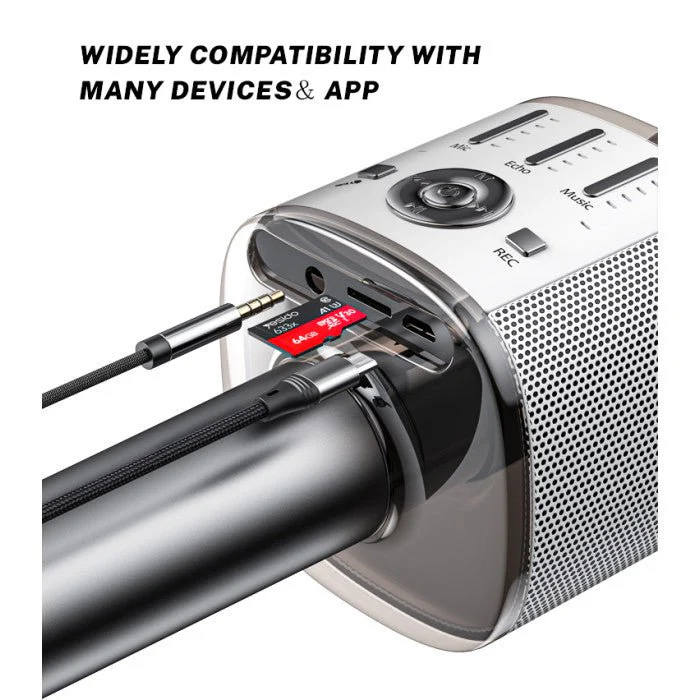 يتميز بسماعة قوية مدمجة داخل المايك لتشغيل الصوت مباشرة بدون الحاجة إلى أجهزة خارجية، وببطارية قابلة للشحن تمنحك تشغيلًا مستمرًا لساعات من المرح 🔋