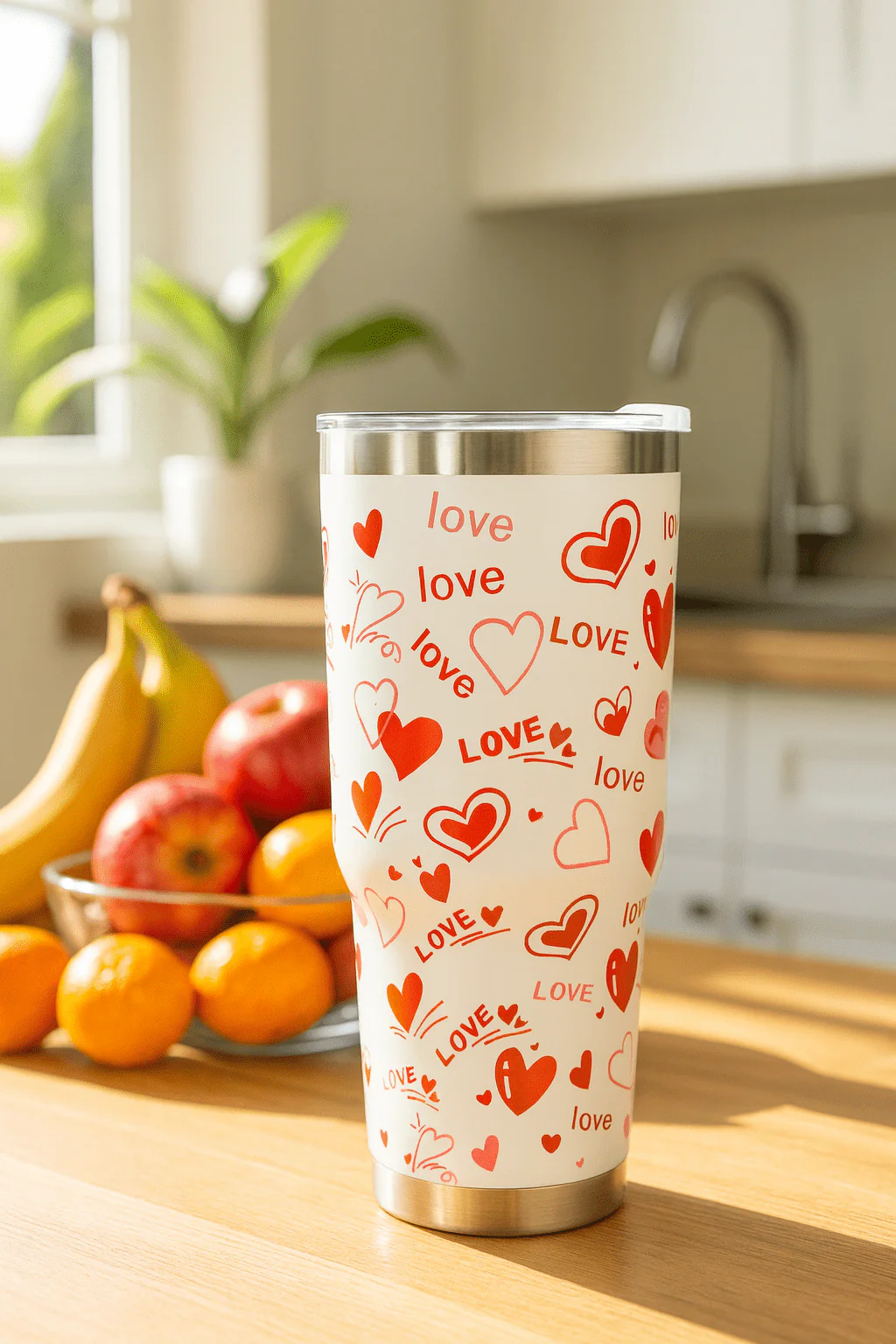 كوب السفر الحراري بطبعة Love يجمع بين الأناقة والوظيفة في تصميم واحد مميز.