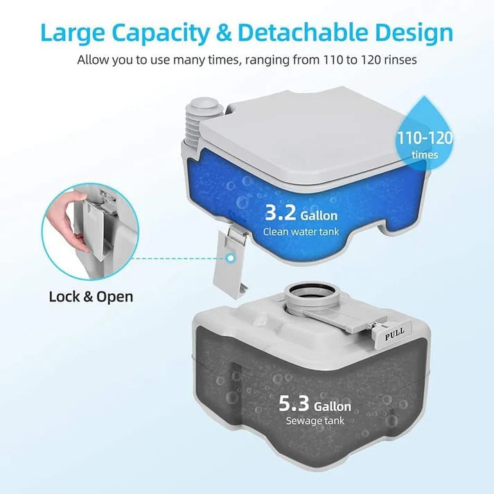 يوفر مرحاض التخييم المحمول حلاً عمليًا ومريحًا للنظافة أثناء الرحلات البرية والتخييم والسفر بالقوارب أو السيارات المتنقلة، بفضل تصميمه المدمج ونظام الخزان المزدوج الذي يحاكي تجربة المرحاض المنزلي دون الحاجة إلى كهرباء أو توصيلات مياه.